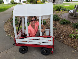 We arrived in the early afternoon after a pleasant drive on prairie blue highways and immediately went to the Visitors Center to sign up for the guided tour. The center is located in a beautiful Victorian-era house with three important buildings on the property, the original Surveyors' House and the schoolhouse that Laura and Carrie attended, as well as a replica of the Webster School, the last school in which Laura taught before she was married. The grounds are filled with amusing items and were bustling with young families eager to make their own Laura memories, some in period dress.